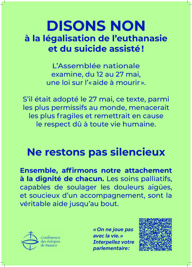 Mgr Luc Crepy a adressé le 12 mai 2025 une lettre aux parlementaires des Yvelines relative aux projets de loi sur la fin de vie discutés actuellement à l’Assemblée Nationale. Retrouvez ici le texte de cette lettre, n’hésitez pas à la faire suivre et à vous associer à la prière de notre évêque.